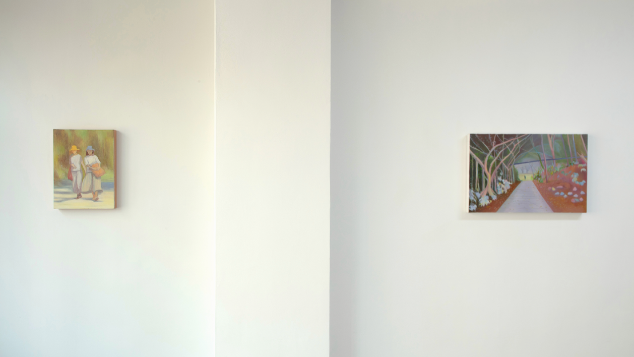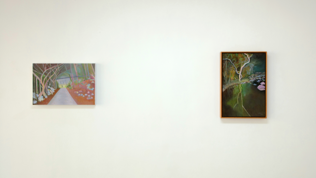 One of the works in the exhibition, Trunk and Its Shadow at Night, depicts the early hours of the morning in a rural landscape. A tree, stream, colorful stones, and the surrounding weeds are arranged by a beam of light, artificially creating a scenic setup. The reflection in the stream contrasts with the main objects, creating a contradictory tension. This piece conveys an experience of being within nature and becoming one with it, reflecting thoughts on constraint and release, examination and reflection.